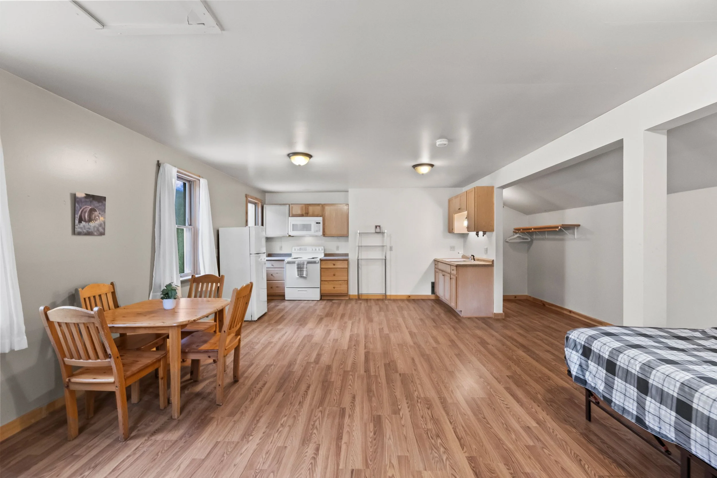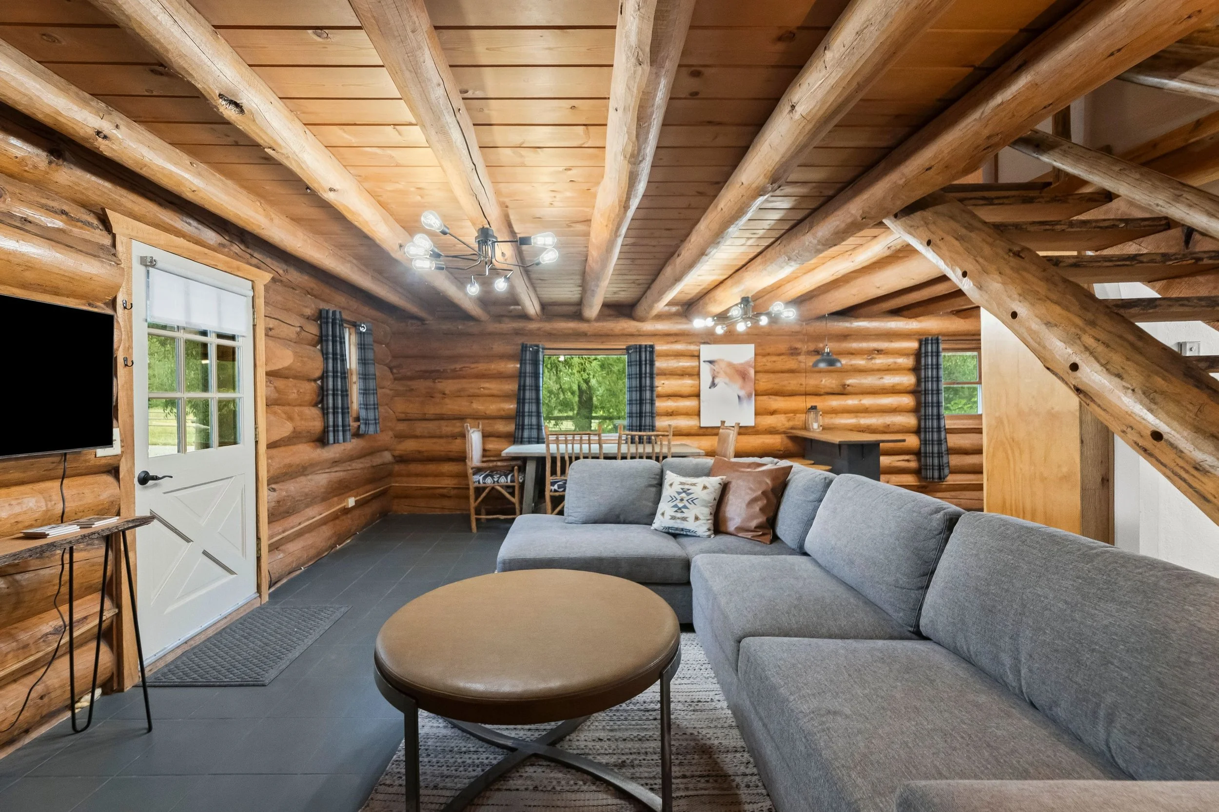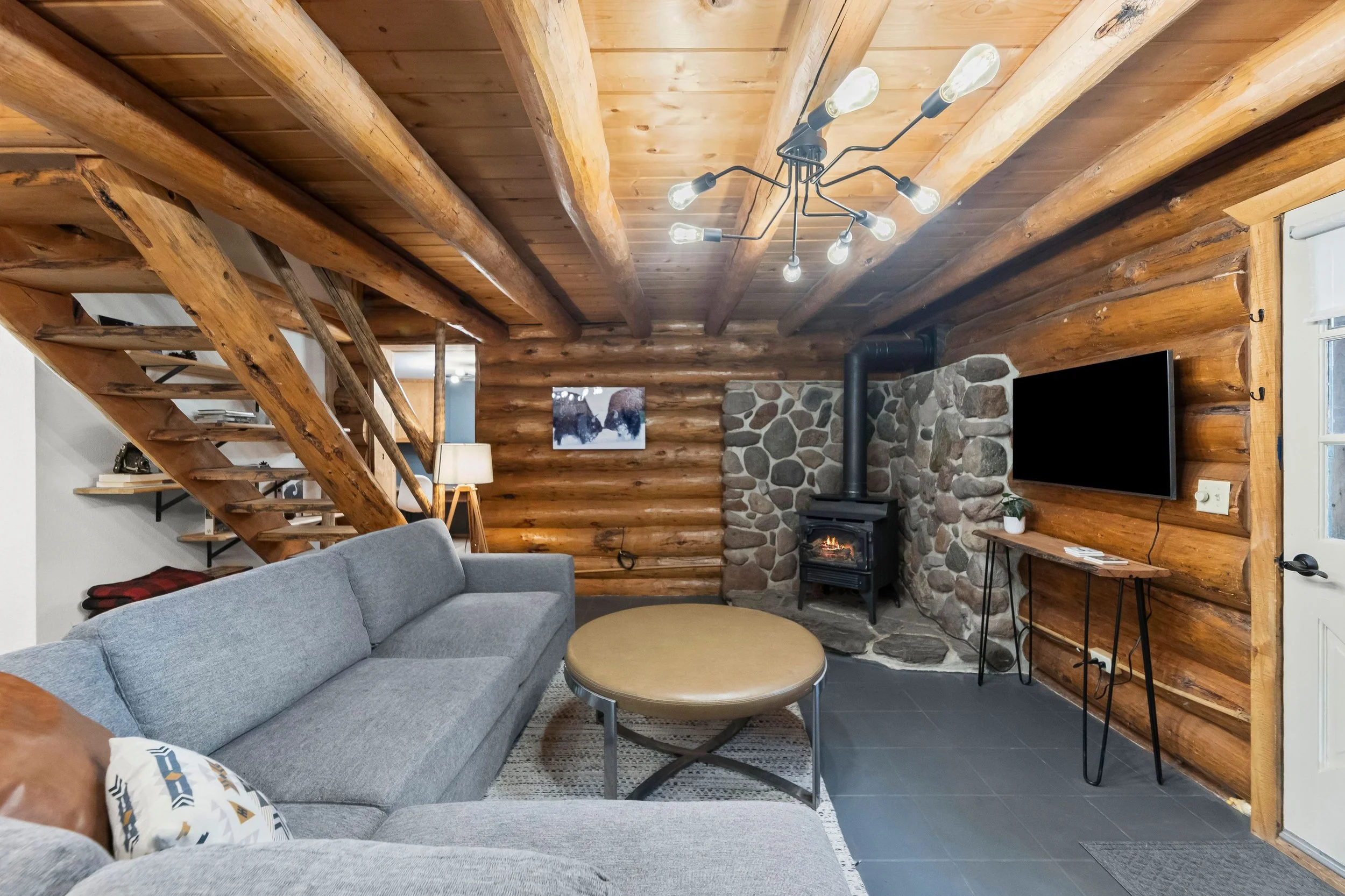 The main log cabin is a beautiful 1,294 sq ft home that is fully furnished and ready for immediate rental or as your new primary residence. It features two comfortable bedrooms, two bathrooms, a beautifully updated kitchen, a laundry facility area, and an open family room with a gas fireplace. Additionally, there are non-conforming sleeping quarters in the attic with two twin beds. The three additional bunkroom rental units are all attached to the detached garage, separate from the main cabin, which is ideal for a private residence with separate rentals. Bunkrooms: Unit One: One bedroom, one bathroom, a kitchenette, laundry facility hook-ups and a gas fireplace in the living room area. Unit Two: A fully furnished studio with one bedroom, one bath, and a kitchenette. Unit Three: A studio featuring one bedroom, one bath, a kitchenette, and a gas fireplace. While one bunkroom is fully furnished, the other two are awaiting your personal decorative touches.